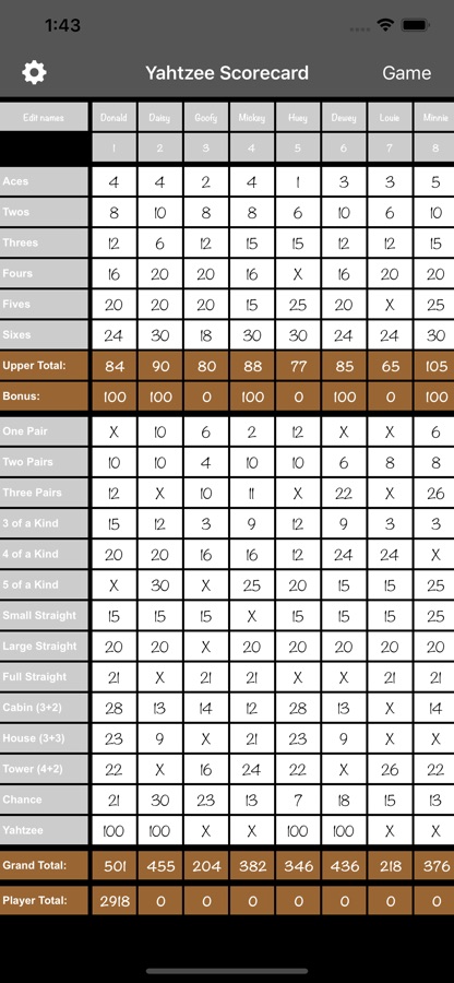 Yatzy Scorecard