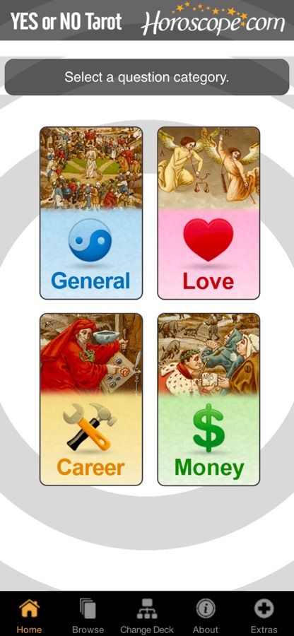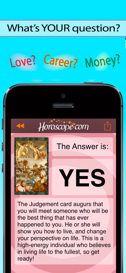 Select the category your issue relates to – love, career, money, or life in general, ask your question, shake the deck, and tap the card of your choice… in an instant, your answer appears!