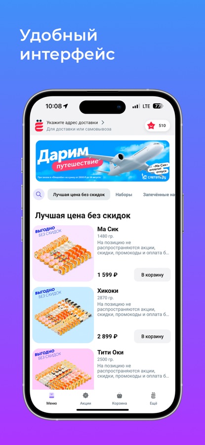 Удобный интерфейс поможет вам легко сориентироваться в меню, зонах доставки и оформить заказ с оплатой в пару кликов.