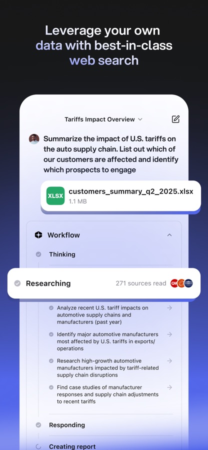• Get accurate answers to complex business questions. Combine web research with your company’s data using the latest AI models. Our world-class platform performs computations, builds models, and reads hundreds of articles at blazing speeds—transforming raw data into actionable insights.
