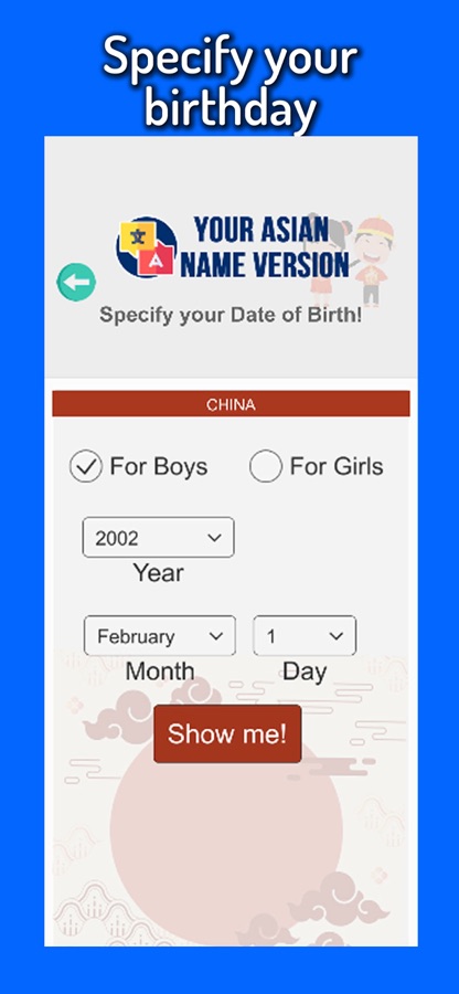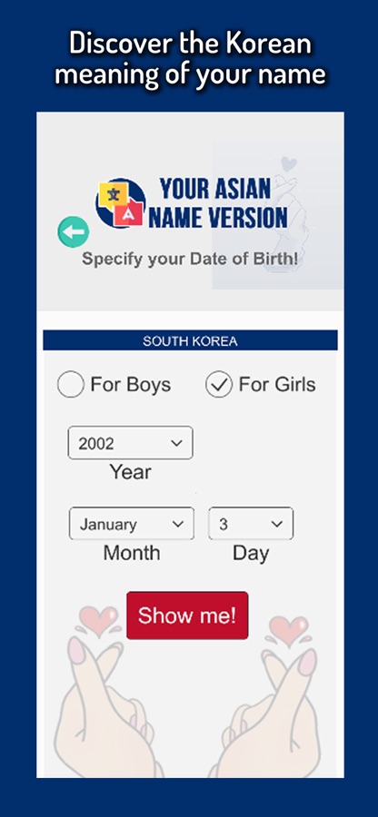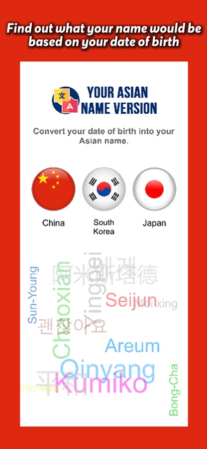 Would you like to know what your Asian version would be called? With Your Asian Name Version, you can discover your first and last name in Japanese, Korean, and Chinese, based on your date of birth. This app is pure fun and entertainment because, in addition to showing you how your name is written in different Asian scripts, it also reveals the meaning behind each one.