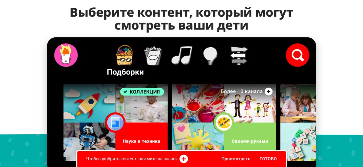 — Только одобренный контент. Выбирайте каналы и подборки, которые будут доступны в профилях детей.
