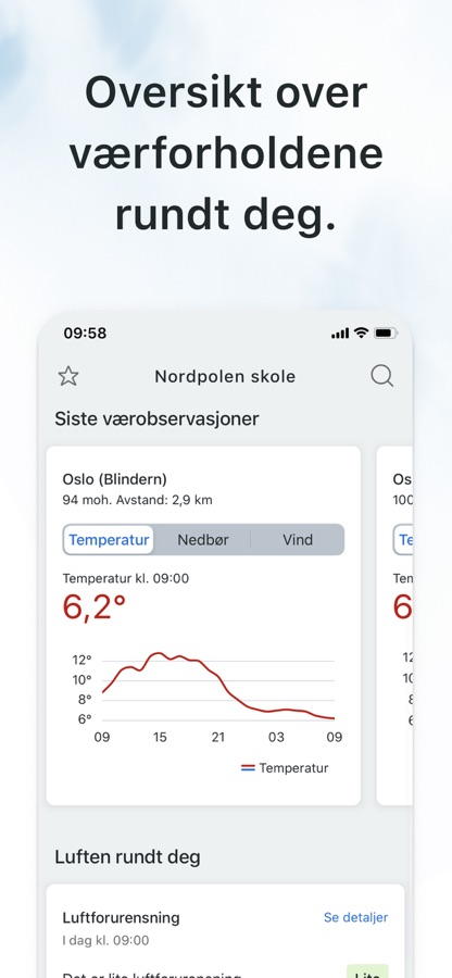 Under «Rundt deg» får du oversikt over luftforurensning, pollenspredning og UV-varsel, i tillegg til de siste værobservasjonene i ditt område.