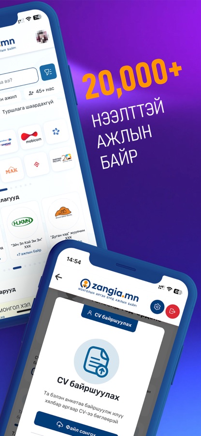 Zangia.mn нь Монголын хөдөлмөрийн зах зээлд ажил олгогч болон ажил горилогч нарт бүрдүүлэлт, сонгон шалгаруулалт, хувь хүний хөгжил, карьер хөгжлийн чиглэлээр цогц үйлчилгээ үзүүлэгч үндэсний компани юм. Бид 2009 оноос хойш үндсэн үйл ажиллагаанаас гадна “Хүний нөөцийн сонгон шалгаруулалт”, “Хөдөлмөрийн зах зээлийн судалгаа”, “ERP систем хөгжүүлэлт” “Академи”-ийн онлайн сургалт, шалгалт зэрэг хөдөлмөрийн зах зээлд чиглэсэн олон ажлыг амжилттай хийж байгаа билээ.