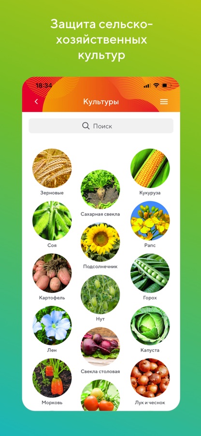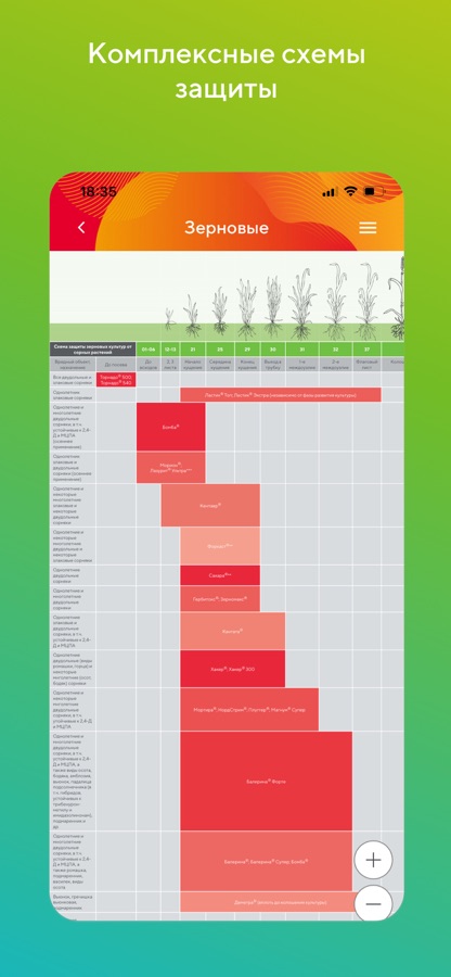 — Раздел «Культуры» с интерактивными схемами по защите сельхозкультур и списком зарегистрированных на них препаратов.