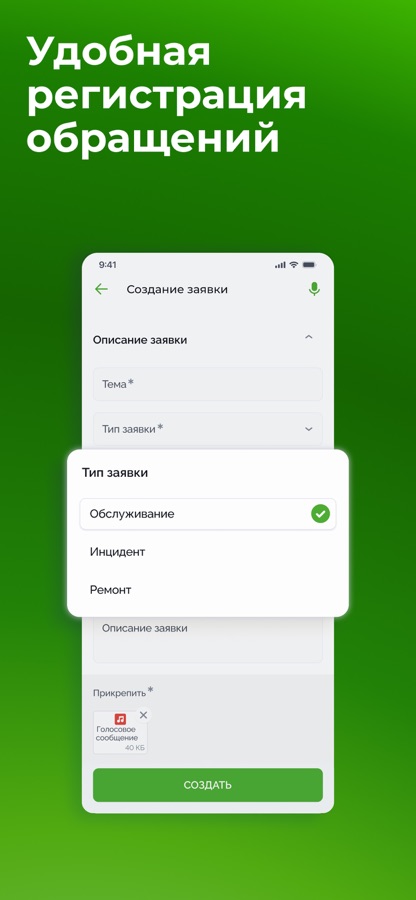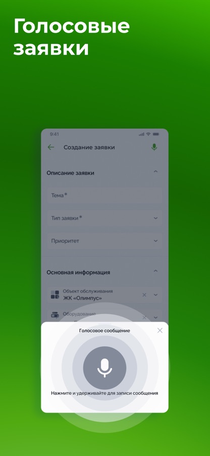 — создавать заявки и добавлять комментарии к ним с помощью голосовых сообщений (они будут автоматически переведены в текст);