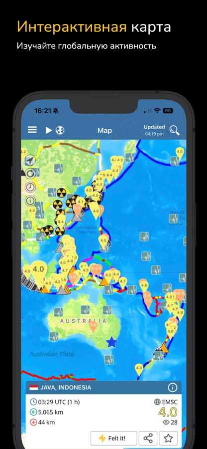 — Отображайте сейсмические и вулканические данные с помощью разных слоев карт.