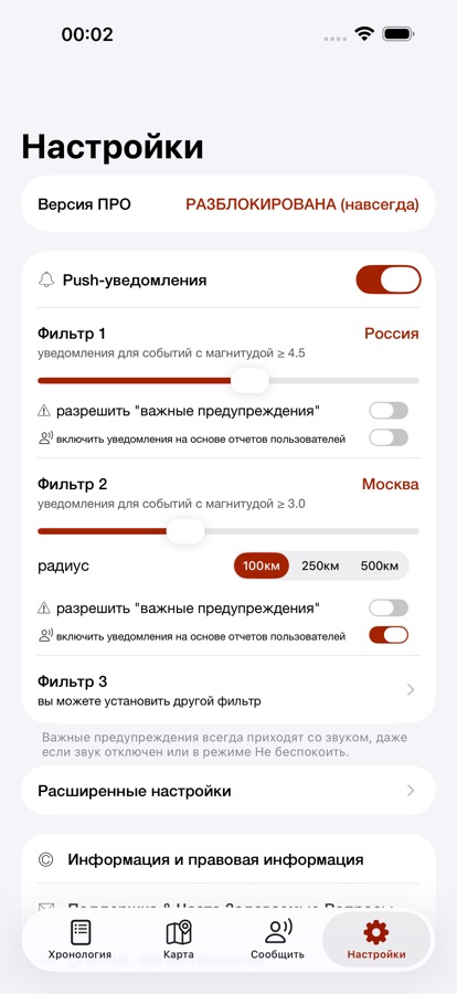 • Информативные push-уведомления сразу после поступления данных из официальных источников (можно настроить до четырёх оповещений по местоположению и/или порогу магнитуды), а также возможность подписки на уведомления на основе пользовательских отчётов до официального подтверждения (быстрее)