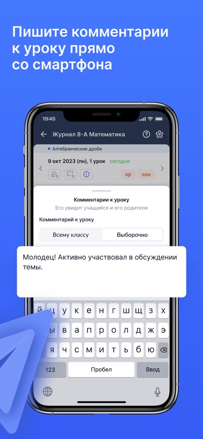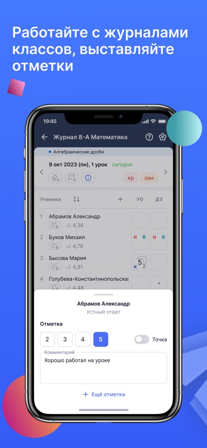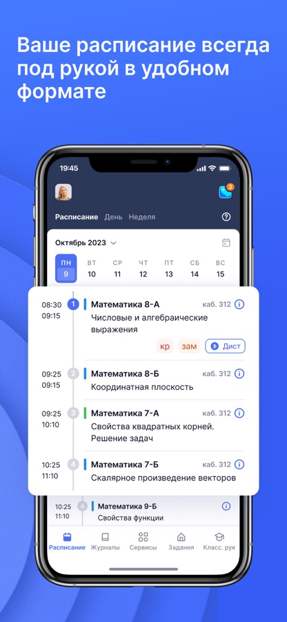 С помощью мобильного приложения вы можете просматривать свое расписание, работать с журналом класса, в том числе выставлять и удалять отметки, выдавать домашние задания, отмечать отсутствующих и использовать иные полезные функции, которые необходимы учителю.
