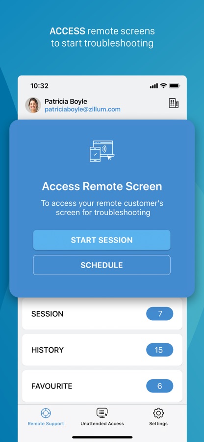 Technicians can use Zoho Assist to launch a remote support, screen sharing, or unattended access session to support customers and fix issues in real time.