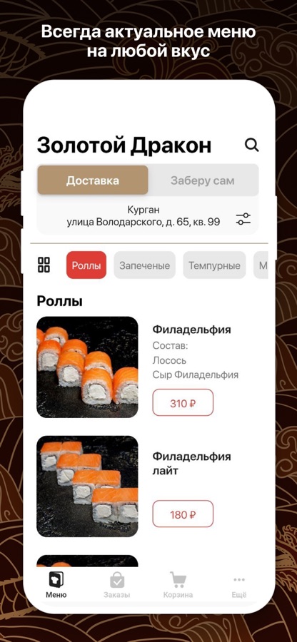 Дорогие друзья! Откройте для себя наш широкий ассортимент роллов – от классических с поджаристым лососем и крем-сыром до экзотических с креветками и авокадо. Мы гарантируем отличный вкус и качество каждого блюда!