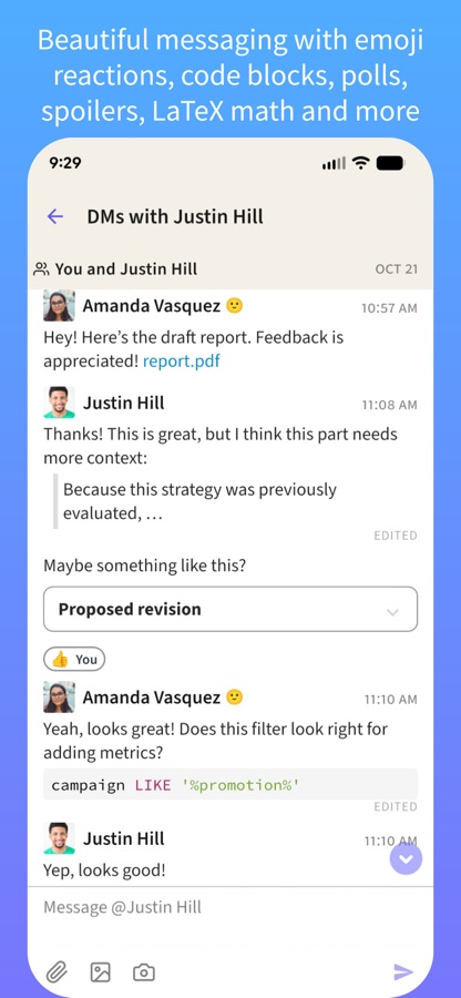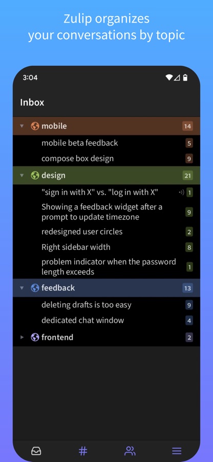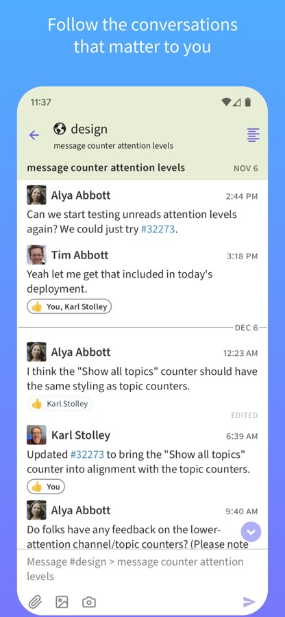 Unlike other chat apps, Zulip lets you read and respond to every message in context, no matter when it was sent. Maintain your focus and then catch up on your own time, reading the topics you care about, and skimming or skipping the rest.