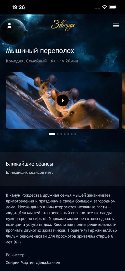 Официальное мобильное приложение кинотеатра «Звезда» для просмотра афиши и покупки билетов.