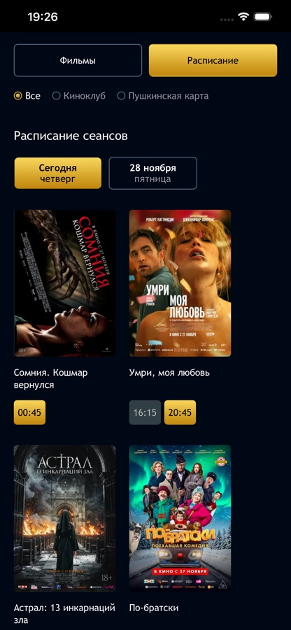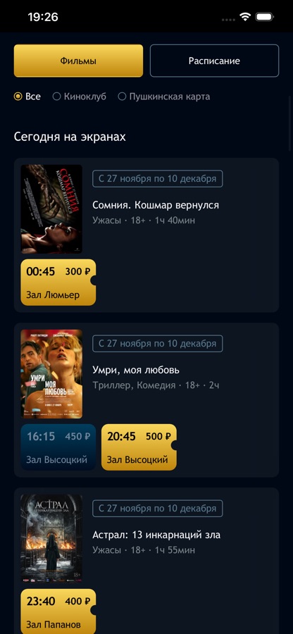 — просмотр информации о кинопоказах;