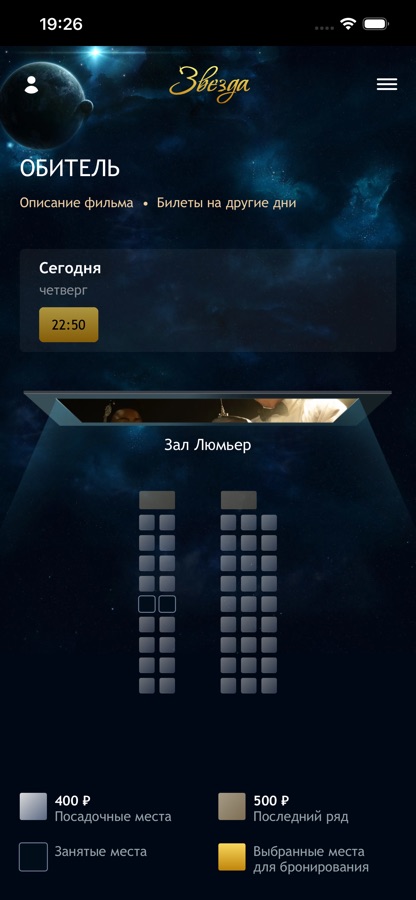 — просмотр информации о фильме и выбор места в зале;